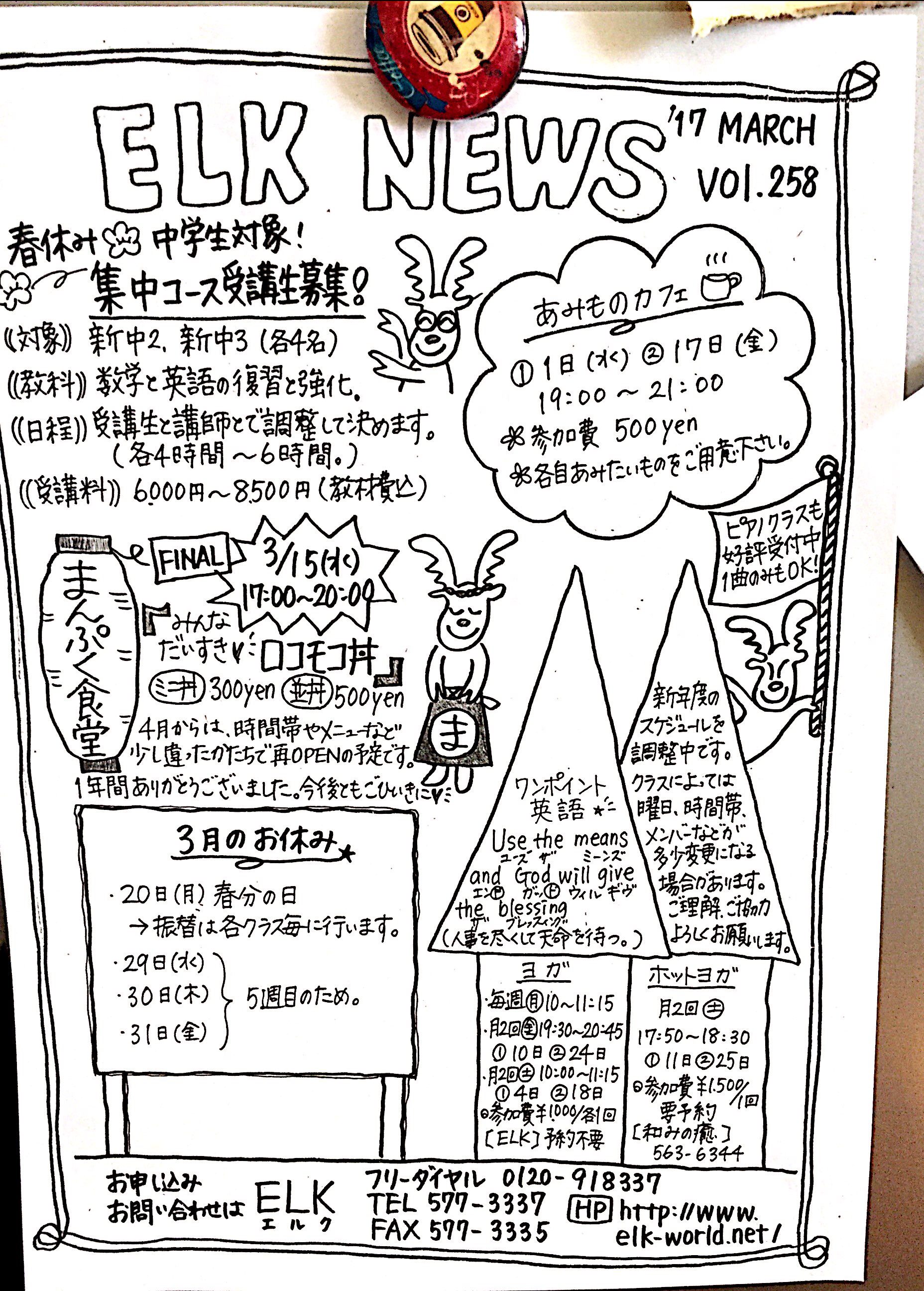 ELK News 3月号 2017/03/01 エルクの3月のスケジュールです。 新年度の英語クラス生徒募集や、パティシエキッズ、まんぷくのお知らせなどの正式な(笑)チラシは、4月に出ます。 楽しい企画色々思案中です。 どうぞお楽しみに♬