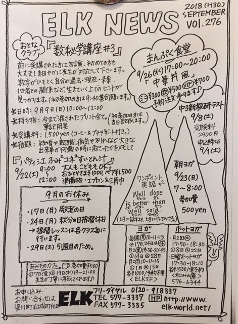 ELK NEWS 9月号🎶 2018/08/30 明日からもう9月😮 朝夕が涼しくなり、秋の気配もチラホラと感じられるようになりました。 過ごしやすい季節、美味しいものが沢山ある秋、今から待ち遠しいですね♥️