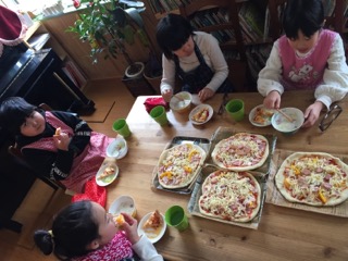 最後に、試食用に私がトッピングした、面白くも何ともない(笑)普通のピザと、あまり野菜とチーズも入れた牛乳スープを、皆んなで食べました。