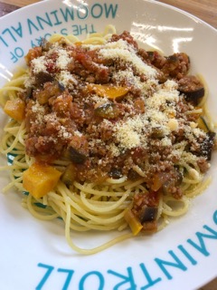 夏野菜のミートソースとリコッタチーズ入りのハイジの白パン😊