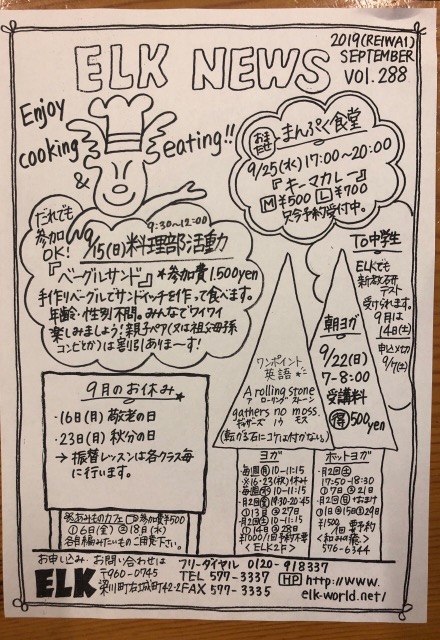 ELK NEWS 9月号🎶 2019/08/31 早朝の空に、秋の気配を感じる9月となりました。 梅雨のジメジメと真夏の暑い間、お休み頂いていた「まんぷく食堂」も、今月から復活です。 面白そうだなとヒットするものがありましたら、どうぞ楽しんで下さいませ😊 お問い合わせも、ご遠慮なくどうぞ🎶