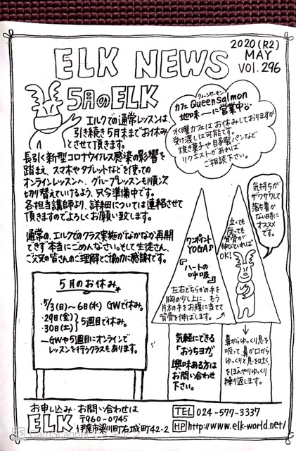 ELK NEWS 5月号🌱 2020/04/30 あっという間に5月に突入です。 子供達の元気な姿や笑い声を、一刻も早くそこここで見たり聞いたりできる日が来る事を、心底願っています。 グループレッスンもGW明けからオンラインで始めます。 慣れるまで不具合もあるかと思いますが、ご理解ご協力宜しくお願い致します。 子供達の心のケアも兼ねて、少しヨガのポーズや呼吸法なんかも取り入れていきたいと思っています🧘♀️