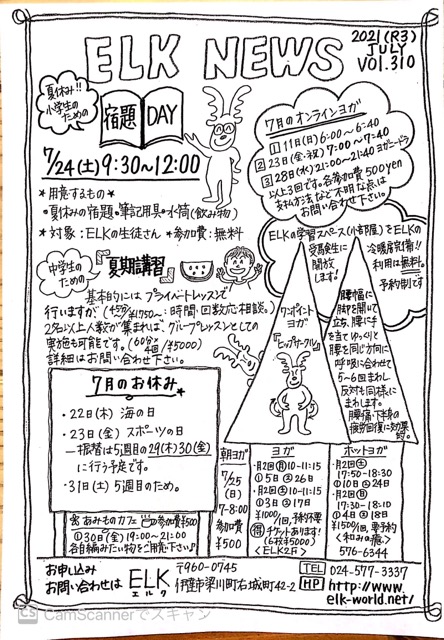 ELK NEWS 7月号♪ 2021/06/30 あっという間に、今年も後半戦に突入! 暑さに雨にコロナ、それぞれの様々な問題、大変そうだけど、小さな楽しい事見つけながら、トボトボながらも、乗り切っていけたらいいですね💪