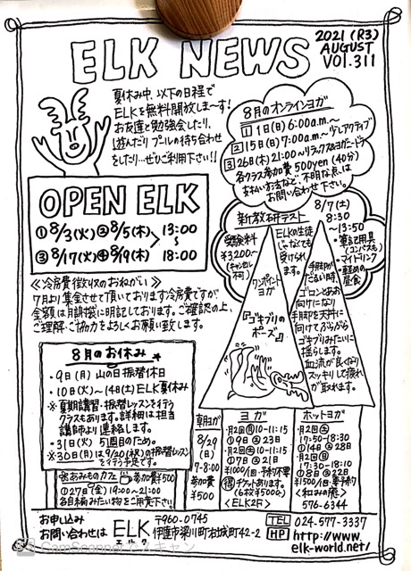 ELK NEWS 8月号🌻 2021/07/30 コロナに台風に加えてオリンピックも始まり、ザワザワした状態の中、もう8月😦 相変わらず私達は基本ステイホームを決め込んでいますが、元気で無邪気で可愛い子供達に沢山救われています。 皆んな頑張ってる、老若男女みんな頑張ってる。でも頑張り過ぎず、上手くネジを左に巻いたりしながら、どうにかもう一踏ん張り、乗り切っていきましょう! 先ずは今ここ、今日一日かな!