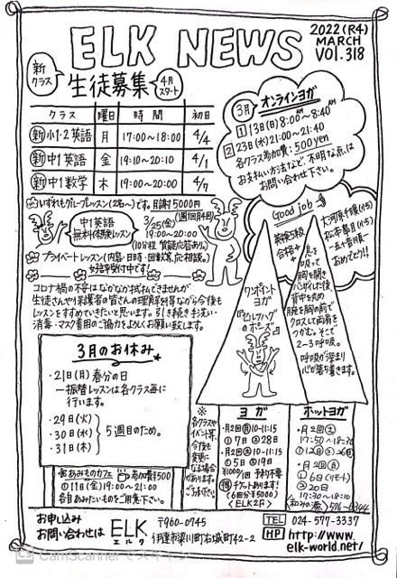 ELK NEWS 3月号🌷 2022/02/28 あっという間に3月です。 続くコロナ禍に加えて、ロシアのウクライナ侵攻と、心落ち着かぬ日々が続きますが、確実に日差しは春めいてきており、心が和みます。 こんな状況下で頑張っていた受験生も、間も無く受験本番。ホントに偉かったな。 平常心で持ってる力を出し切ってね! 世界が平和で穏やかな日常を、1日も早く取り戻せますように。 Peace and Light!