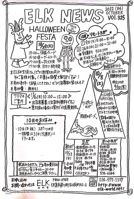 ELK NEWS 10月号🎃 2022/09/30 驚くべく速さで季節が移ろいます😲 今月は、ハロウィンとフェスタもあるので、お楽しみに♪ 来月はフリマも予定しています。 このまま、穏やかで平和な日常が少しずつ戻ってきますように。