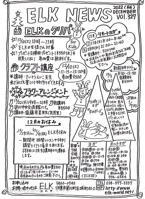 ELK NEWS 12月号🎉 2022/11/30 いよいよ、今年のカレンダーも残すところ最期の1枚となりました。 まだまだ色んな大変な事が続きますが、どうにかこうにか、楽しい事探しながら、乗り切っていきましょう〜🎄