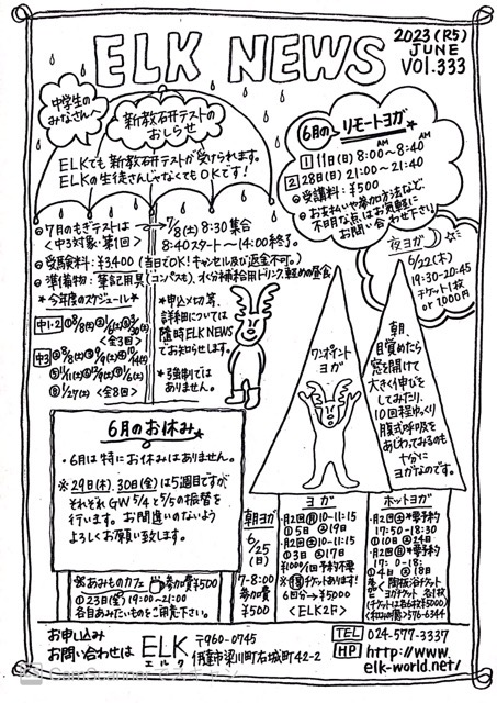 ELK NEWS 6月号☔️ 2023/05/31 もう6月,梅雨の季節。 体調に気をつくながら,乗り切っていきましょう☔️ リモートヨガが28日(日)となっていますが28日(水)の間違いです。御免なさい。