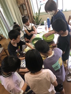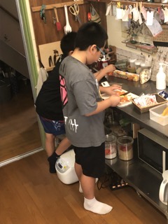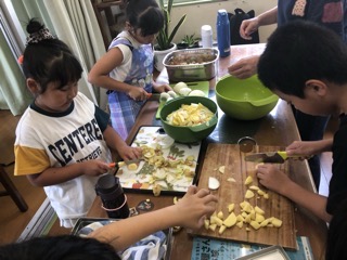 カレー作りも,野菜切ったり炒めたり混ぜたり、全員1人残らずやりたくて、パテシエの時の子供包丁も総動員。