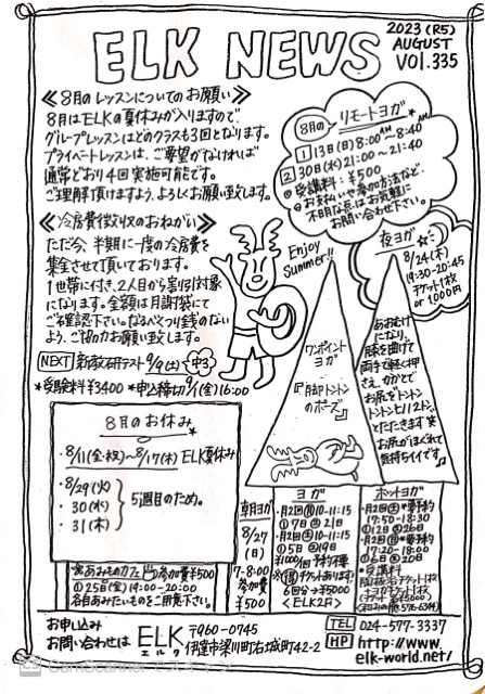 ELK NEWS 8月号🍉 2023/07/31 色をんな事が、よく分からないままに日常が戻った感がある😆溶けるような暑さの夏。 時の流れと異常な暑さに追いつけないのは、年を重ねたせいもあるけど、世の中が何となく落ち着かないのもあるのかなと思ったり。 でも取り敢えず,今出来ることを,なるべく楽しんで,どうにか乗り切っていきたいですね。