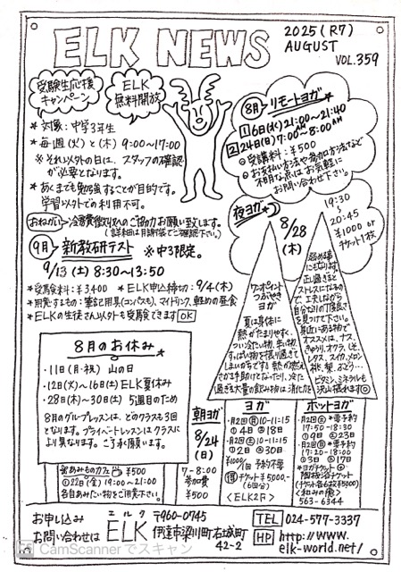 ELK NEWS 8月号🍉 2025/07/31 子供の頃は、夏休みも8月に入るともう終わっちゃう😫なんて思ったりしたものです。 今となれば、ひと月の休みがどれだけ貴重なものだったかが分かります😌 今日は驚くほど涼しく、こんなご褒美デイがあると、一瞬でも暑い夏を乗り切れそうな気がしてきます。 一生は続かないこの暑さ、どうにか工夫しながら休みながら、無理せず乗り切っていきましょう💦